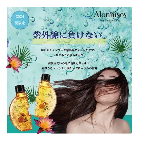 夏の限定商品をアピールするため、透明感のある水と泡の背景を使用。キャッチコピーには太陽とシャンプーの色を掛け合わせた黄色い下線を引き、視線を誘導しています。